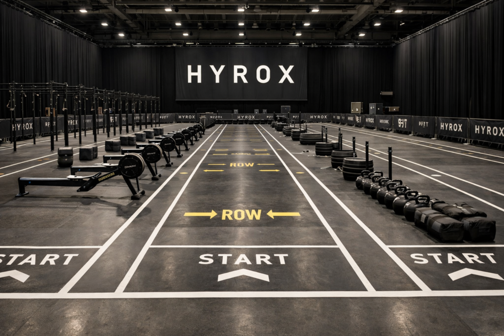 Hyrox events United Kingdom competition floor with running lanes and workout stations